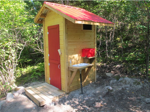 Composting outhouses are similar to conventional outhouses in construction, with the exception that they don't require a pit to be dug. They use the same materials as traditional outhouses, but instead of a pit, the waste is deposited into catchment containers. These catchment containers can be stationary or mobile.